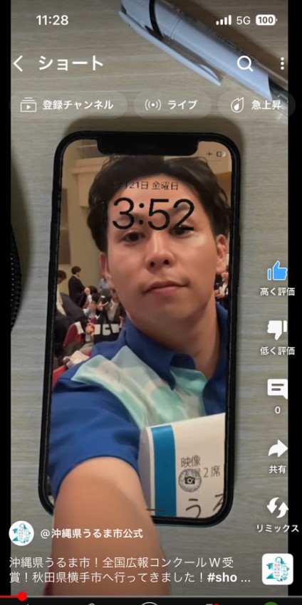 ショート動画にて、全国広報コンクール授賞式の様子を公開しております。スマホ画面から担当者の手が伸びるという映像から始まり、壇上に上がった受賞者目線の映像にしてみました。こちらもぜひご覧ください。(與那城良)