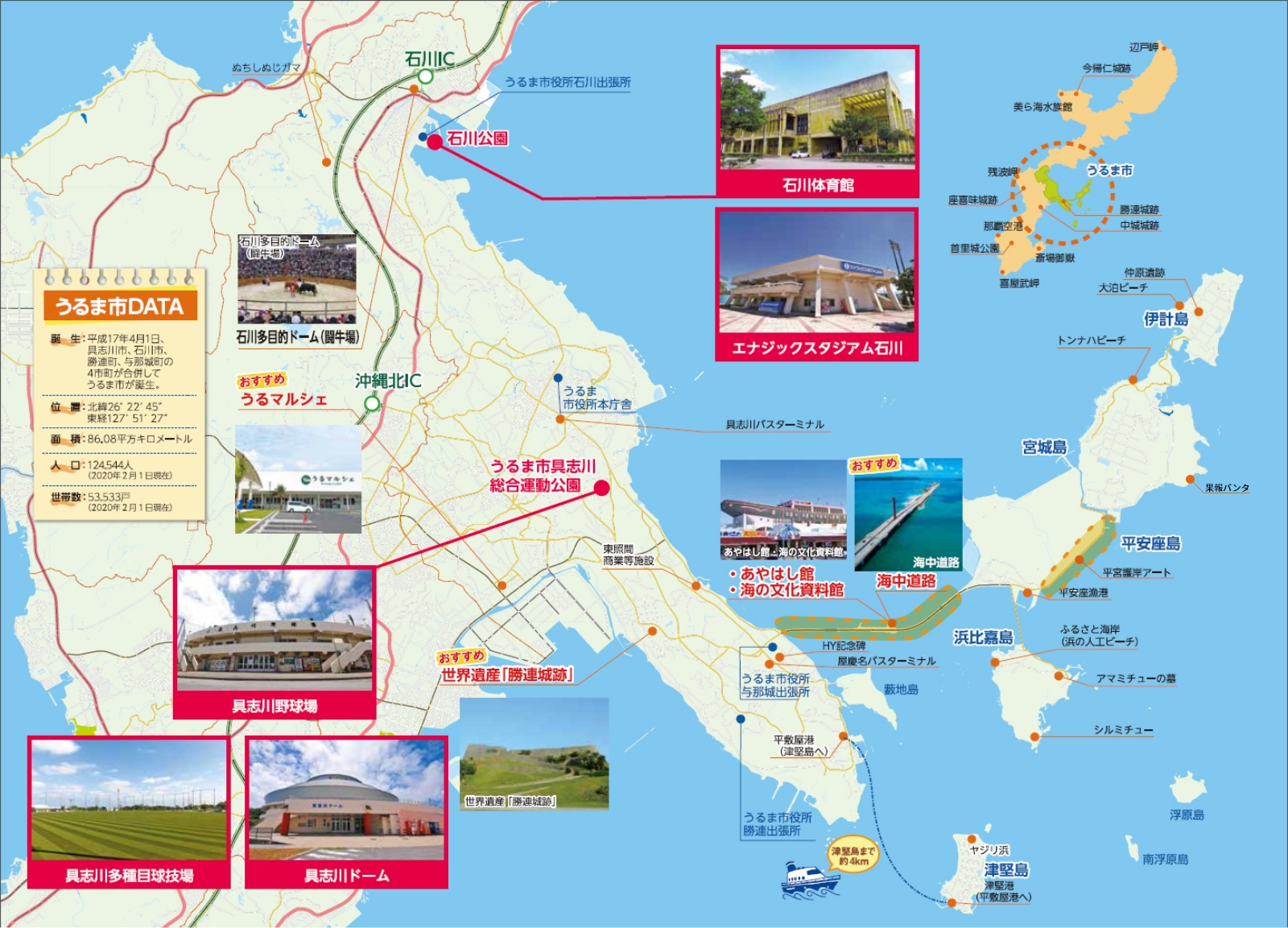 「さんごの島」という意味を持つ沖縄の言葉「うるま」から名付けられたうるま市は、その名のとおり、コバルトブルーの海に囲まれた島々と美しい橋「あやはし」で結ばれる『海』・『橋』・『空』が調和した風光明媚な町として知られています。 那覇空港から車で約50分の場所に位置し、豊かな自然と年中温暖な気候に恵まれたうるま市はスポーツにふさわしい環境で、プロの野球チームやサッカーチームに利用されているうるま市具志川総合運動公園をはじめ、さまざまなスポーツ施設が整っています。